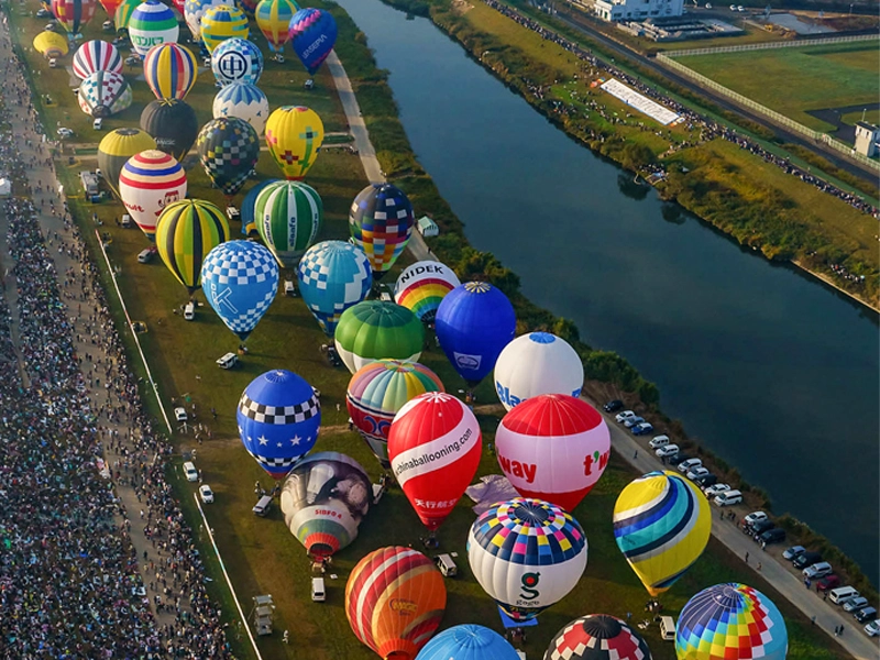 河川敷の上空を飛ぶバルーンと見物の人たち(SIBFO提供)