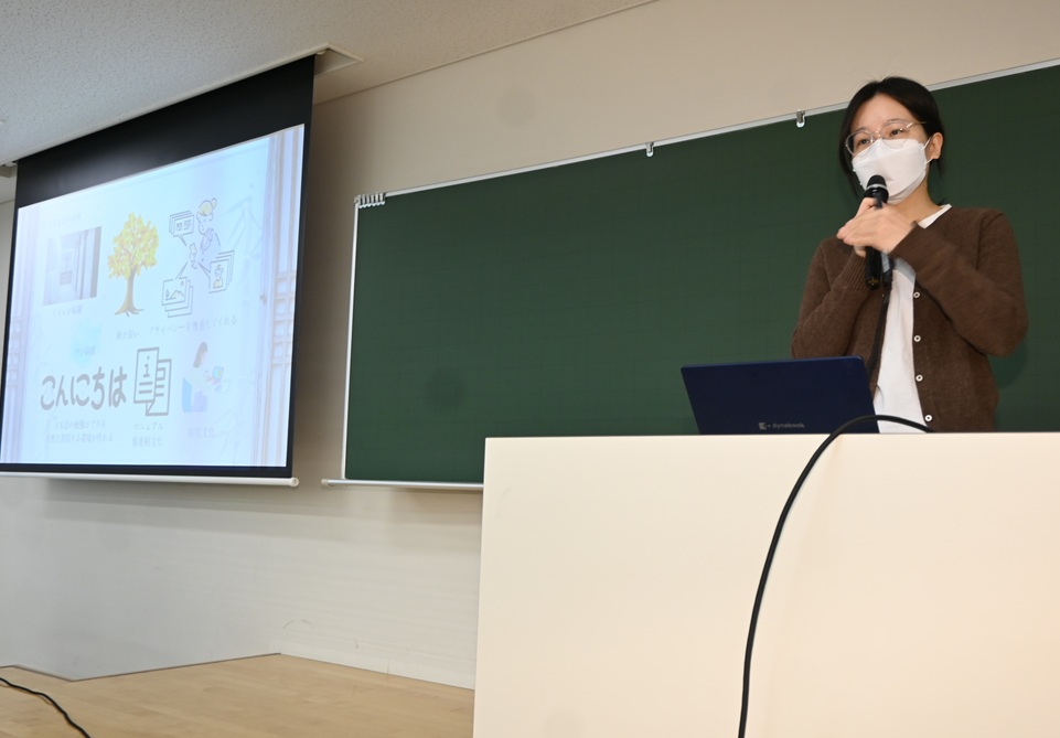 日本語を勉強して難しかった点は、漢字の多様な読み方、キラキラネーム、遠回しの言い方、カタカナ語の英語、敬語、方言と、たくさん。「話せるようになってから文字を勉強した」といい、日本語は韓国と語順が同じで互いに学びやすいことも紹介しました。やはり日本のドラマやアニメ映画を見て単語や文章を覚え、言語交換アプリも使って勉強しました。