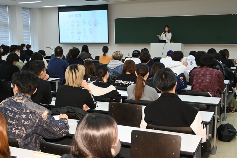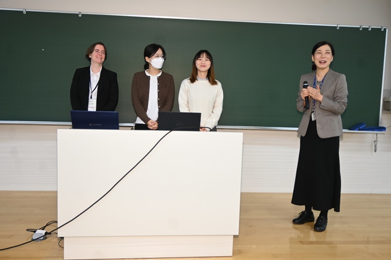 グローバル・コミュニケーション学部の大濱慶子教授が担当する学部講義科目「グローバル化と言語」の授業で12月3日、兵庫県国際交流員の3人が日々の業務や日本語や日本文化に興味を持ったきっかけ、日本語をどのようにして習得したかなどについて流ちょうな日本語で講演しました。
