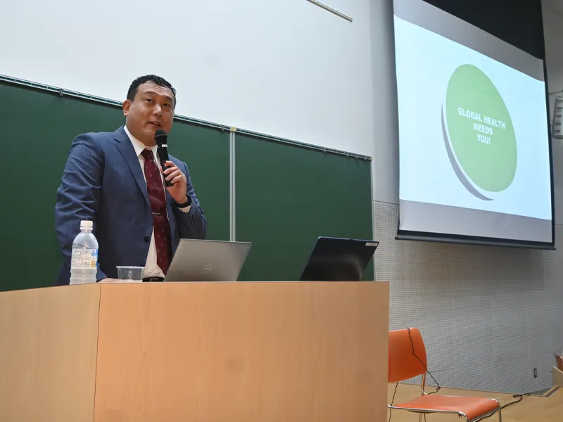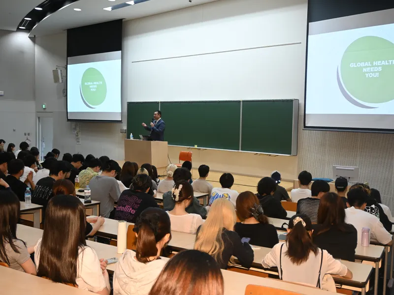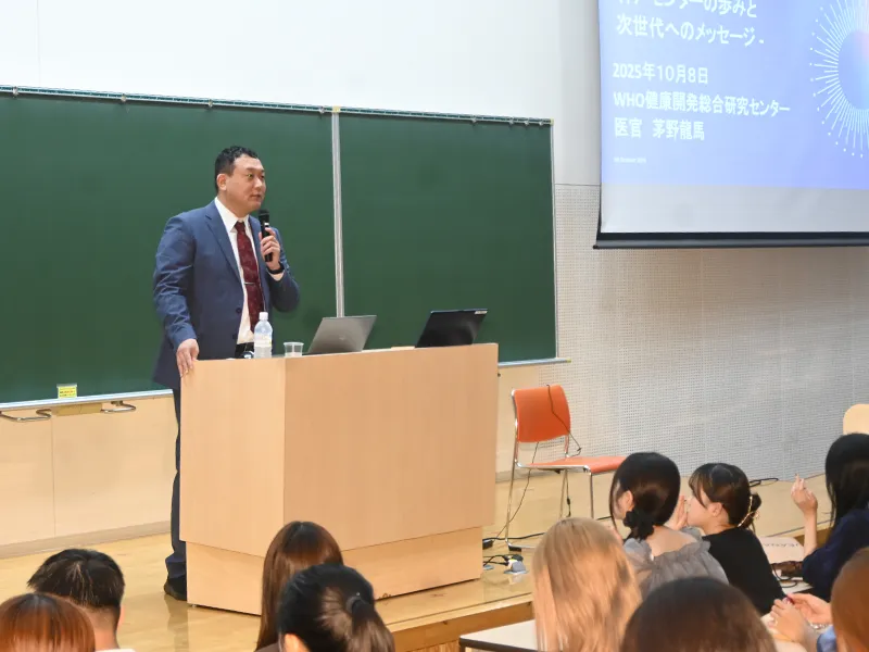 登壇した茅野医官は194の加盟国からなるWHOの組織と国際保健における役割について説明しました。「グローバル・コミュニケーション学部」を意識した「みなさん、国際とグローバルという用語の違いは分かりますか」との問いかけもありました。「国際とは国や国境を意識した国家と国家との関係を言います。一方、グローバルは国も国境も超えた地球規模のという意味です。世界全体を包摂するルールづくりと実践が必要です」と述べ、感染症対策や耐性菌の問題など21世紀の保健・健康課題には国を超えたグローバルな対応が求められることを学生らは強く意識しました。