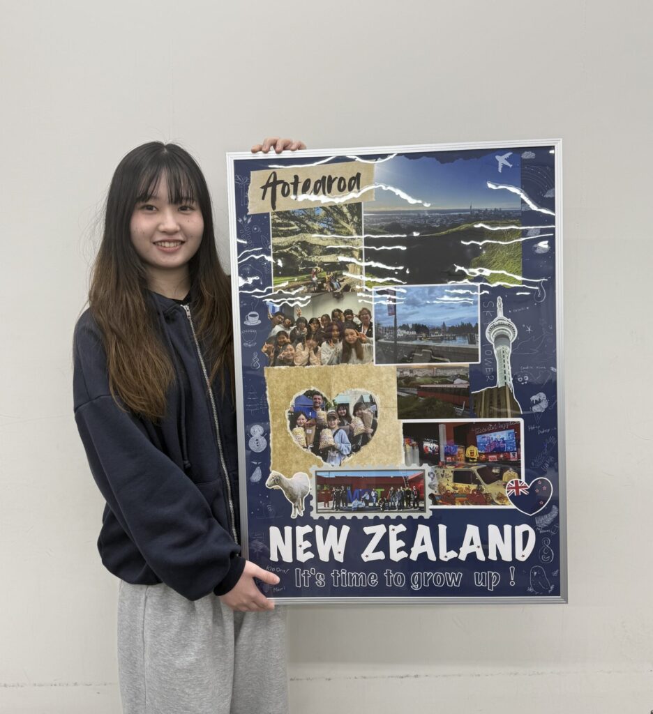 ニュージーランドの壮大な自然をイメージし、青や緑を基調としたデザインに仕上げました。自然の美しさや広がりを感じられるよう意識しています。また、学校ではさまざまな国籍の人と関わることができた経験や、現地で参加したアクティビティの楽しさも伝えたいと考えました。留学を通して得られる出会いや体験の魅力が、ポスターから少しでも感じられれば嬉しいです。