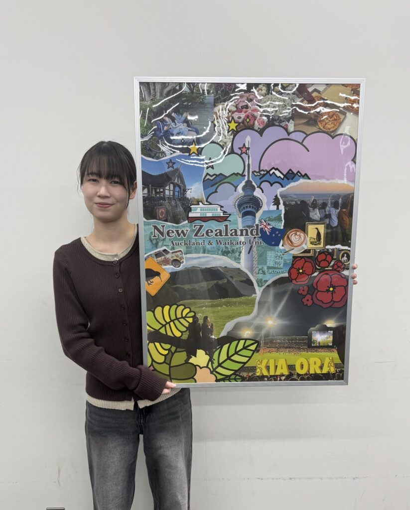 自然と文化の共存をテーマに制作しました。自然の魅力は写真を通して表現し、文化についてはイラストを用いることで、目に見えない価値や雰囲気も伝えられるよう工夫しています。特にニュージーランドの豊かな自然を感じてもらえるよう意識しました。また、留学中にさまざまな場所を訪れた経験から、その土地ごとの魅力や旅の楽しさも表現しています。見る人に、現地の空気感や留学のワクワク感が伝われば嬉しいです。